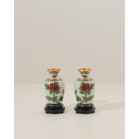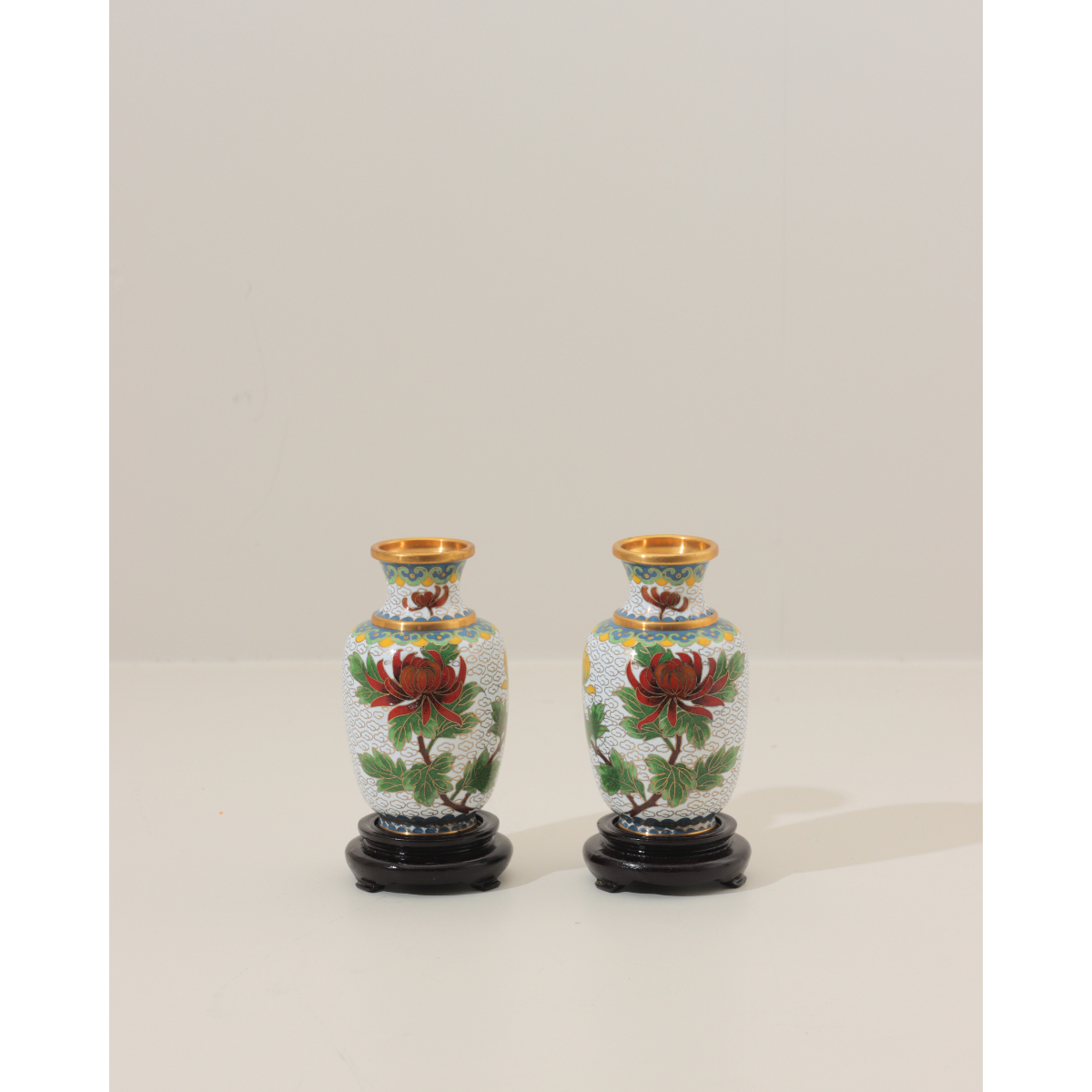 Cloisonné is an ancient decorative technique where vibrant enamel pastes are meticulously applied to a metal mesh overlay and fired in a kiln, creating intricate, luminous designs. This elegant small vase showcases the artistry of this time-honored craft, featuring a white base adorned with delicate red chrysanthemum blooms with a hand carved stand. Each piece reflects the skill and precision required to bring this centuries-old tradition to life, making it a refined addition to any collection.
