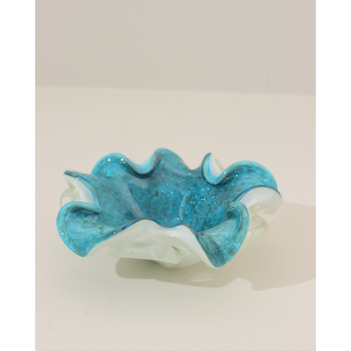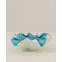 A striking Murano glass bowl that exemplifies Venetian craftsmanship, showcasing a refined contrast between its pristine opaque white exterior and luminous turquoise interior. The gracefully curved rim adds an elegant architectural element, while the translucent quality of the glass allows light to dance through the piece, creating subtle depth and visual intrigue.