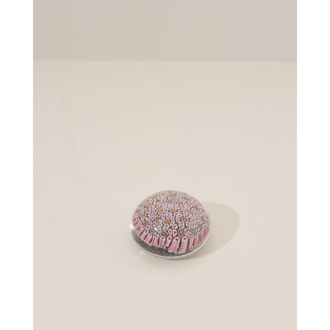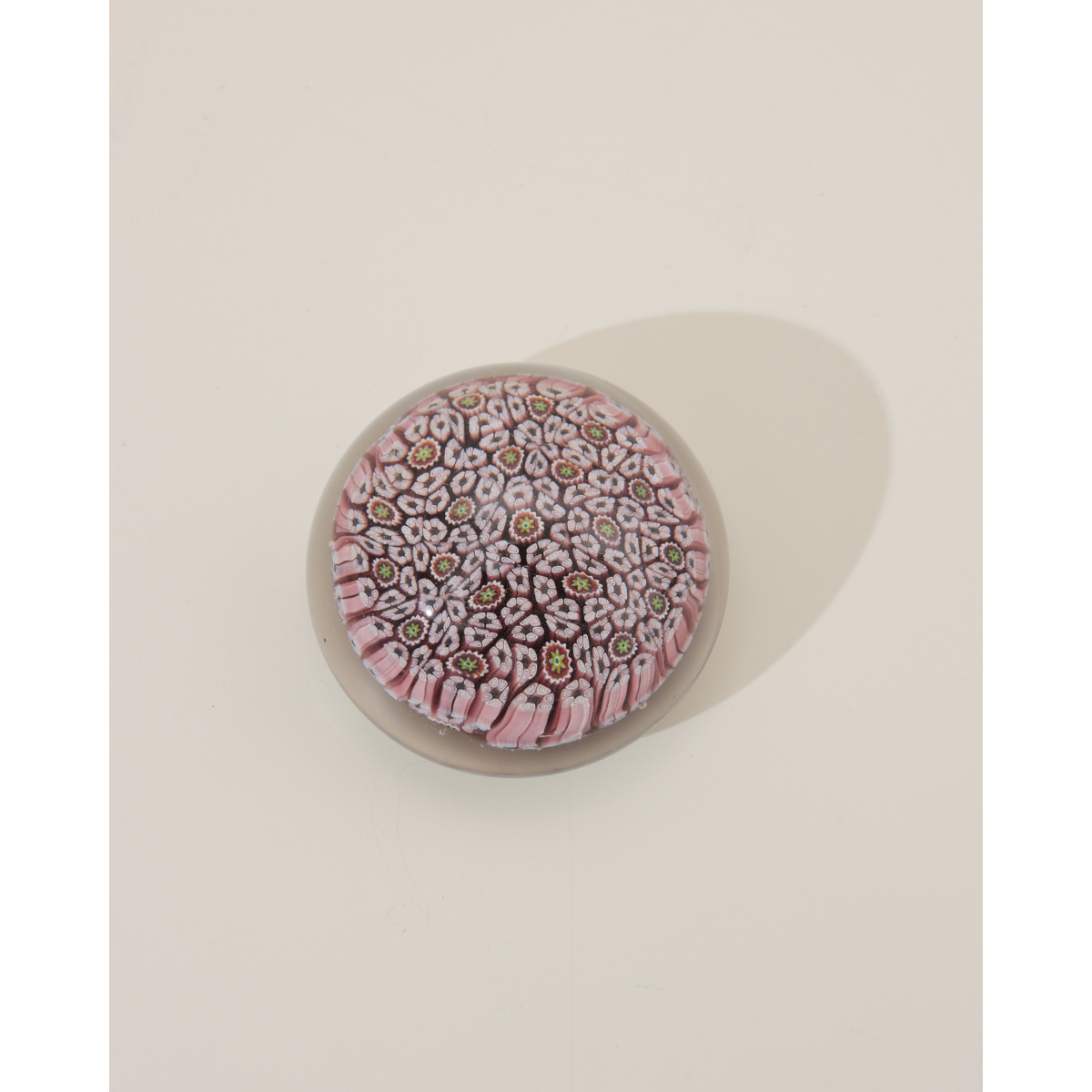 Handblown millefiori paperweight featuring intricate pink and burgundy glass patterns. Each piece showcases traditional glasswork techniques with vibrant, swirled color combinations that catch the light beautifully. Perfect as a desk accent, decorative display piece, or thoughtful gift for art glass enthusiasts.