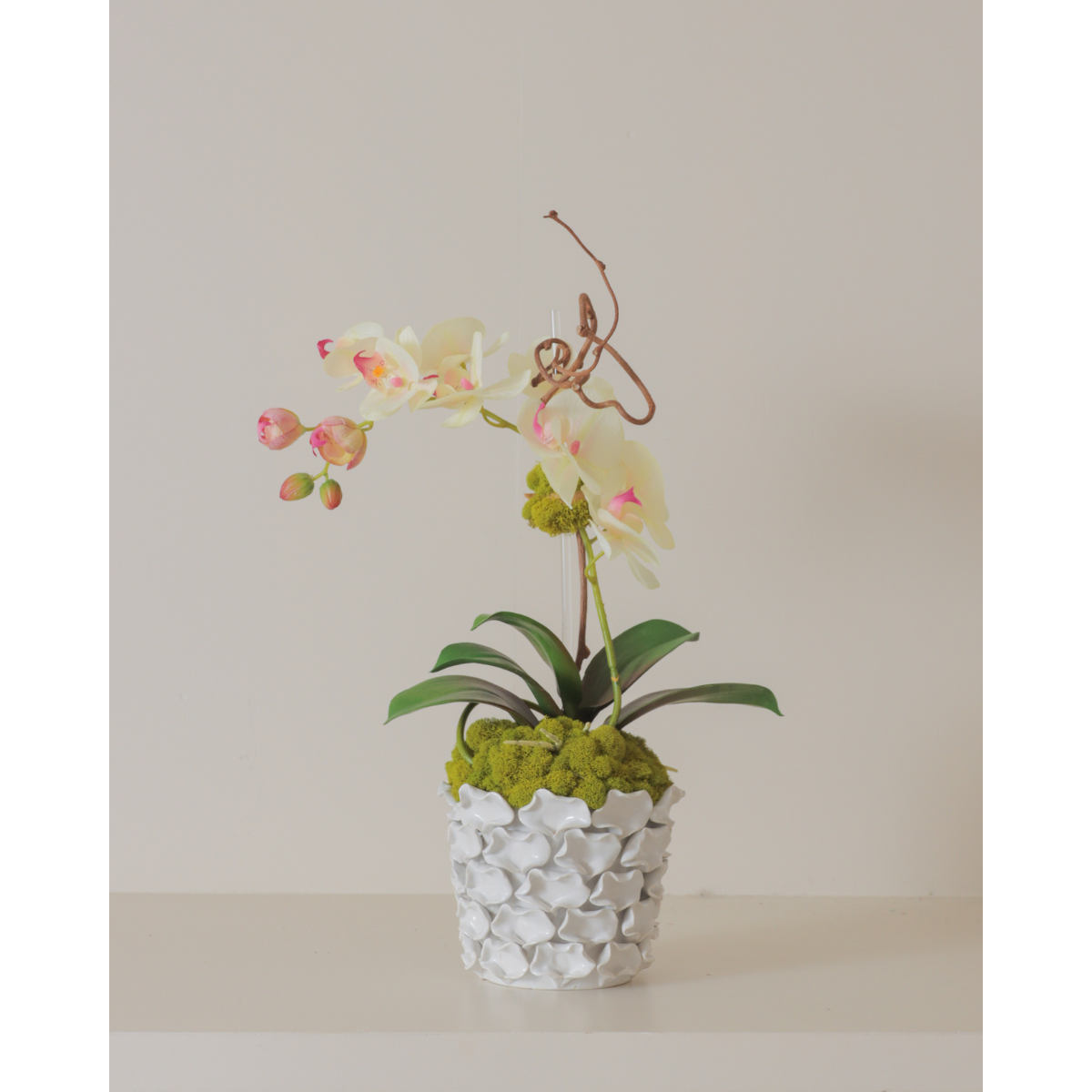 Ivory and blush orchid planted with reindeer moss and curly willow in a white ceramic petal pot. This large arrangement is perfect for any space or as a gift. All floral arrangements are handmade in house by The Collective Floral Design Team.