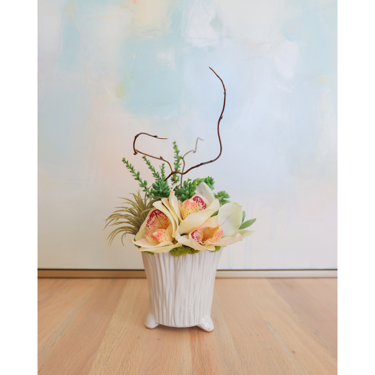 Ivory orchids and various succulents planted with reindeer moss in a white faux bois ceramic pot. This small arrangement is perfect for any space or as a gift. All floral arrangements are handmade in house by The Collective Floral Design Team.