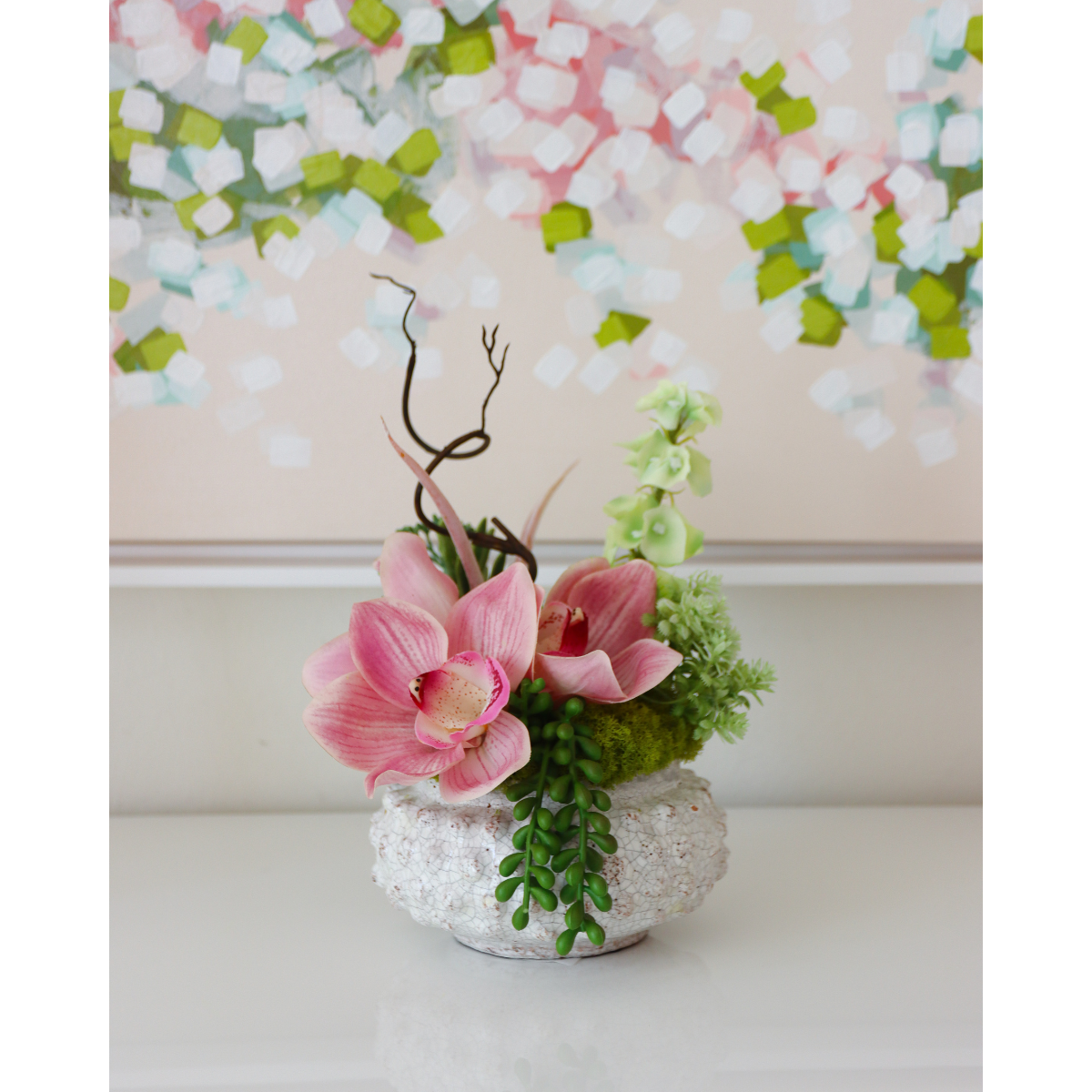 Pink orchid planted with reindeer moss, succulents, and assorted filler in a ceramic bubble pot. This small arrangement is perfect for any space or as a gift. All floral arrangements are handmade in house by The Collective Floral Design Team.