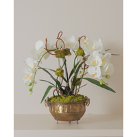 White orchids planted in a vintage brass footed bowl. This medium arrangement is perfect for any space or as a gift. All floral arrangements are handmade in house by The Collective Floral Design Team.