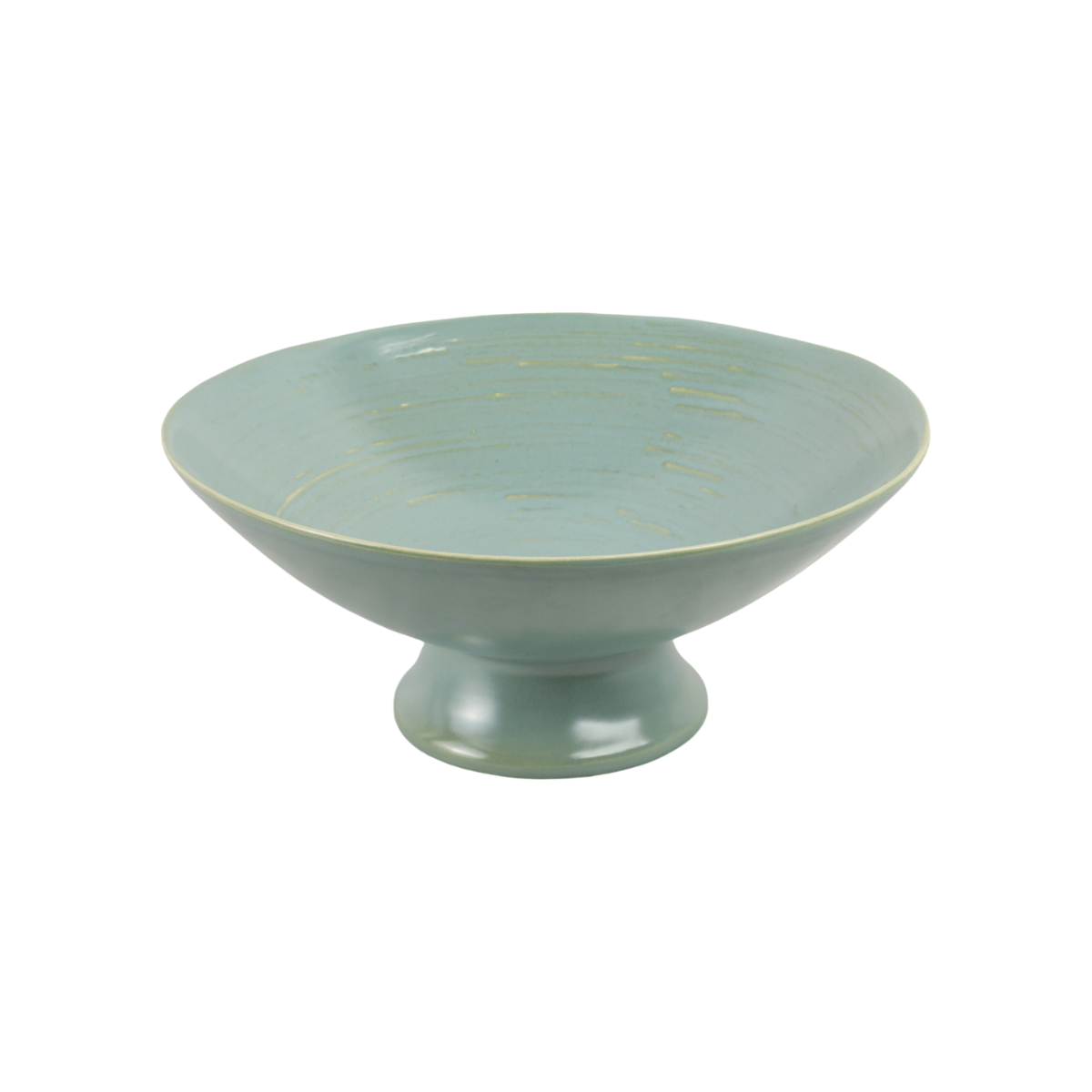 Handcrafted Portuguese stoneware bowl in soft green, featuring a distinctive raised pedestal base and rustic earthen finish. This artisanal piece brings organic beauty to any space—perfect for styling coffee tables, creating a warm focal point in entryways, or showcasing decorative objects.