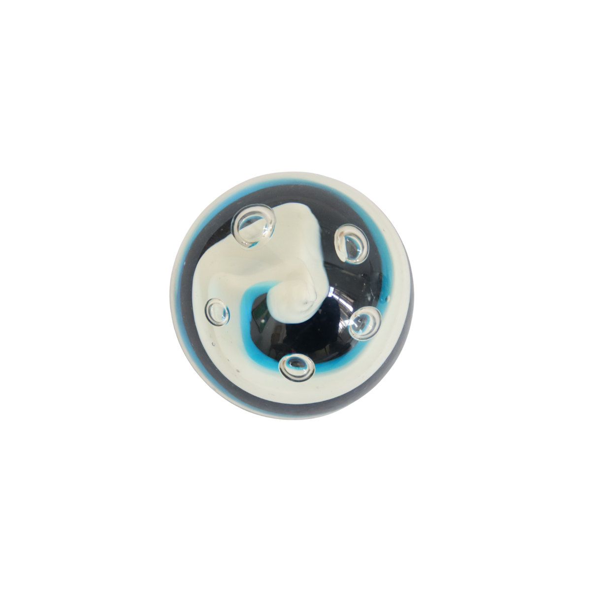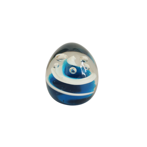 Vibrant handblown Blue & White Swirl Paperweight featuring cascading blue and white tones with distinct bubbling. Each piece reflects the organic nature of the glassblowing process, making it a refined desk accessory or collectible display piece.