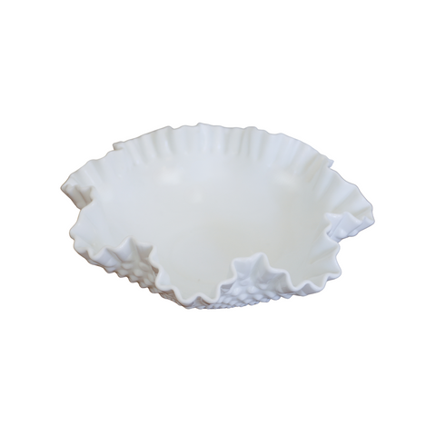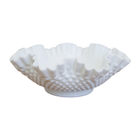 Our Fenton Milkglass Bowl features a milk-white opaque glass with crimped edge and hobnail, or raised, body detailing. Marked on the bottom with the oval Fenton logo, this piece was likely made in or after the 1970's.