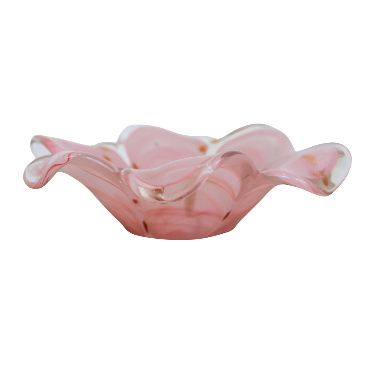 Gradient Pink & Gold Glass Bowl in lovely cascading shades of pink with flecks of gold. This vintage cutie has a small black imperfection in the well of the bowl, so we suggest filling it with your favorite candy or jewelry!