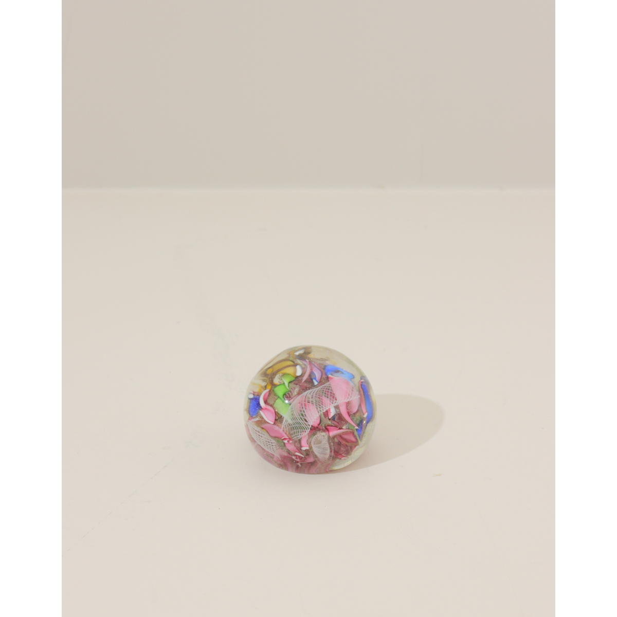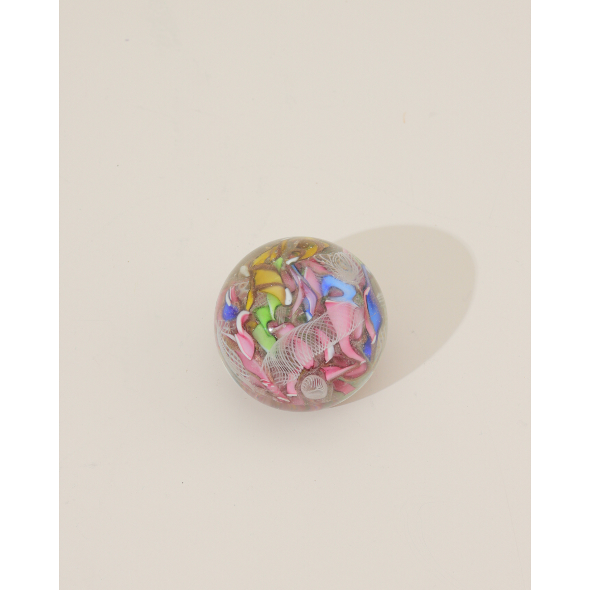 A vibrant celebration of color and craftsmanship, this Tutti Frutti Latticino paperweight brings artisanal glass work to your desk or shelf. Hand-crafted with intricate latticino techniques, delicate white glass threads weave through a playful palette of fruit-inspired hues—creating depth and movement with every angle.