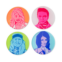 Don't sweat it with this set of 4 coasters featuring your favorite country legends. Made with acrylic, these coasters feature the likes of Dolly, Willie, Loretta and Johnny. Comes in a clear acrylic box perfect for gifting!
